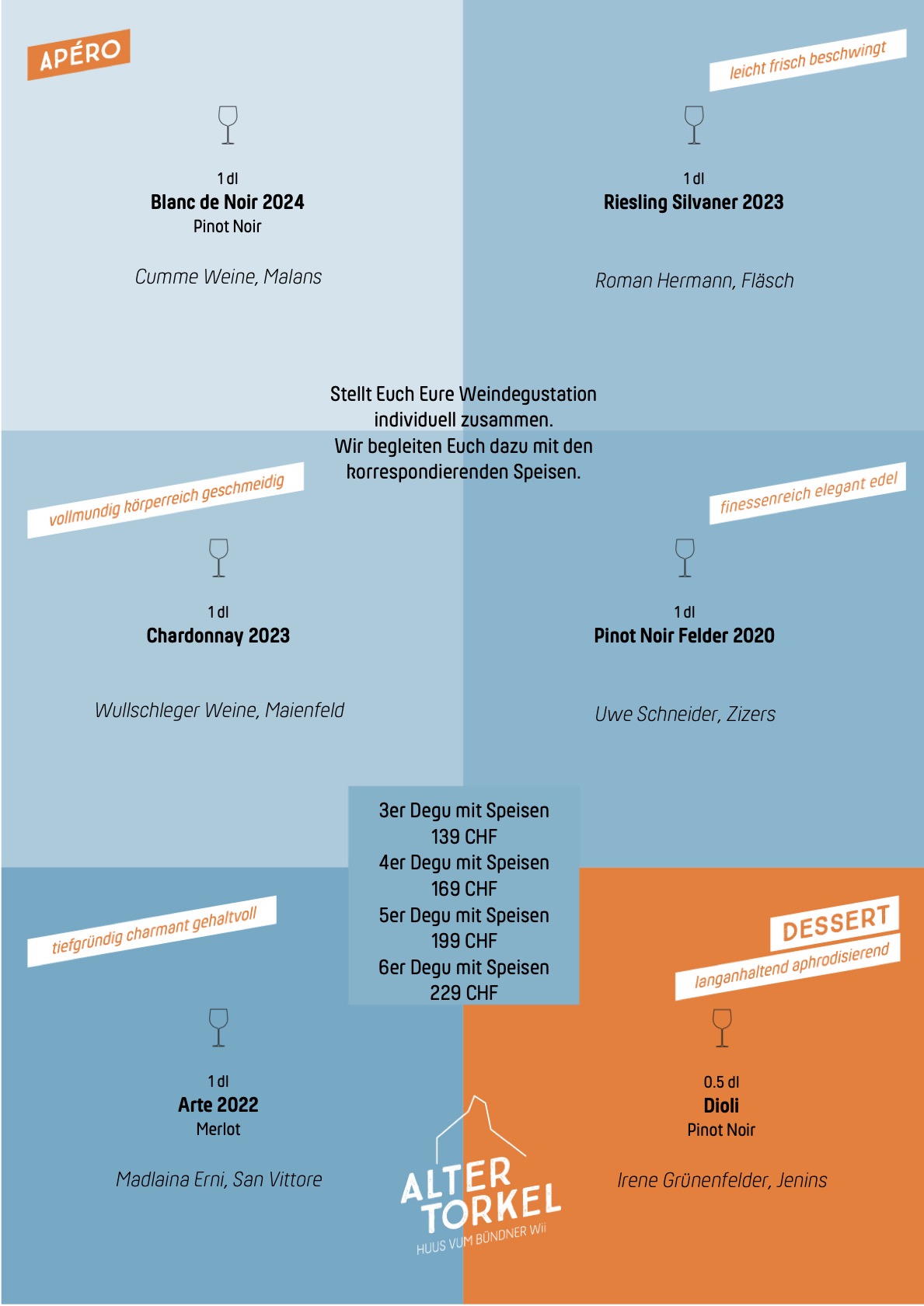 Das Weindegustations-Menü besteht aus sechs Genuss-Feldern, bestimmt von Apéro über beschwingte und vollmundige Weissweine bis hin zu eleganten und tiefgründigen Rot- und feinfruchtigen Süssweinen – alle aus Graubünden, versteht sich. Jeder Gast kann sich somit seine Weinreise aus sechs verschiedenen Weinen individuell zusammenstellen. Wer mag, hat somit die Möglichkeit, einzelne Weine mit den dazu begleitenden Gerichten zu bestellen oder eben gleich eine 3er bis 6er Degustation mit passendem Menü.